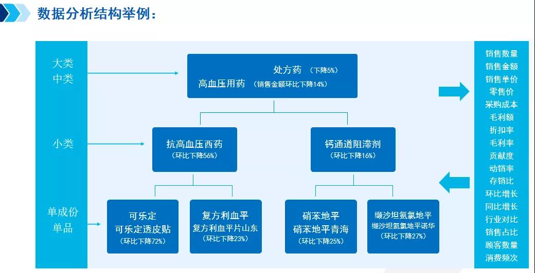 得出分析結(jié)果,提升方案就唾手可得了嗎?并不!確定了核心增長(zhǎng)品類(lèi)之后,需從整體到大類(lèi)、中類(lèi)、小類(lèi)、單成分單品進(jìn)行抽絲剝繭,基于多維逐層分析,最后才能精準(zhǔn)地制定出提升方案。