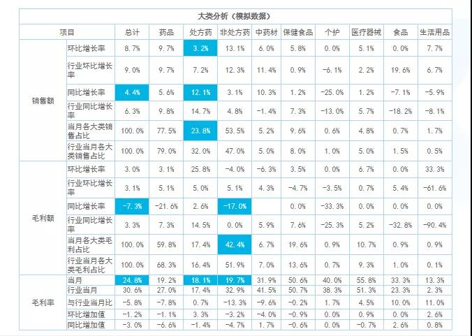大類(lèi)分析主要看整體銷(xiāo)售結(jié)構(gòu),找出核心大類(lèi)的增長(zhǎng)機(jī)會(huì)點(diǎn)。例如,這組數(shù)據(jù)中不管是整體毛利率還是銷(xiāo)售額增長(zhǎng)率,都低于行業(yè)均值。細(xì)分處方藥、非處方藥及中藥等品類(lèi)的情況可以看出,處方藥的同環(huán)比銷(xiāo)售額以及銷(xiāo)售占比均低于行業(yè)值,而毛利率卻高于行業(yè)值?梢缘贸觯瓿踔贫ㄌ幏剿帪楹诵脑鲩L(zhǎng)大類(lèi)的策略沒(méi)有落地。所以,接下來(lái)做中類(lèi)、小類(lèi)跟單成分分析的時(shí)候需要進(jìn)行針對(duì)性監(jiān)控。